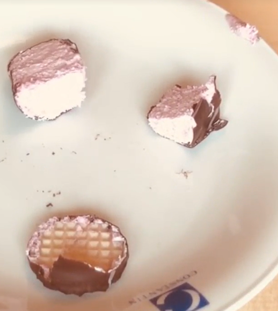 Ich finde, dass der Geschmack nach Erdbeerschaum sehr künstlich ist. Die Schokolade hat gar nichts von Schokolade geschmeckt, sondern nach Erdbeere mit Nudeln und die streifen haben es noch ekeliger gemacht. Es war okay. Aber nur halbwegs.